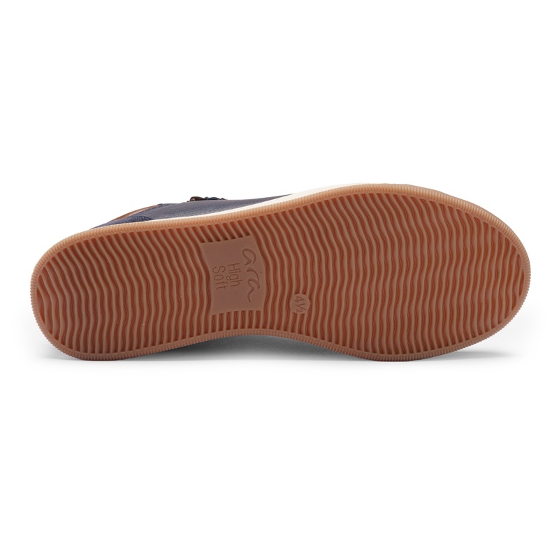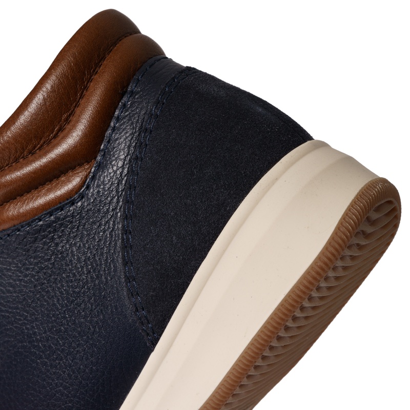 Ce sneaker en cuir marine empiècement marron et lacet marron est d’un grand confort tout en étant tendance.