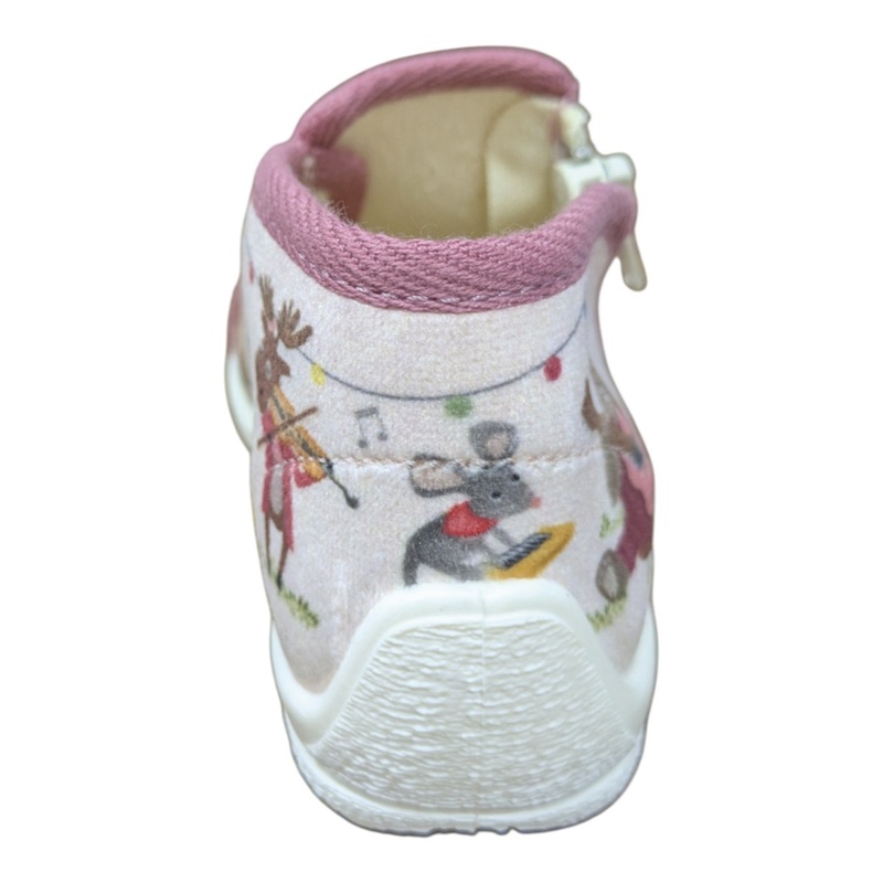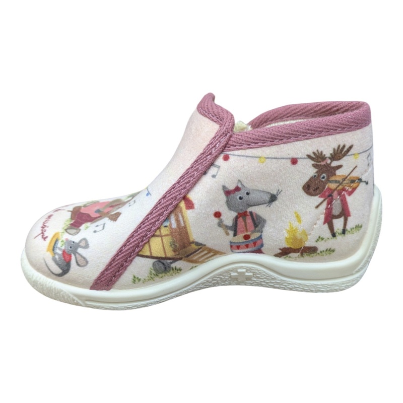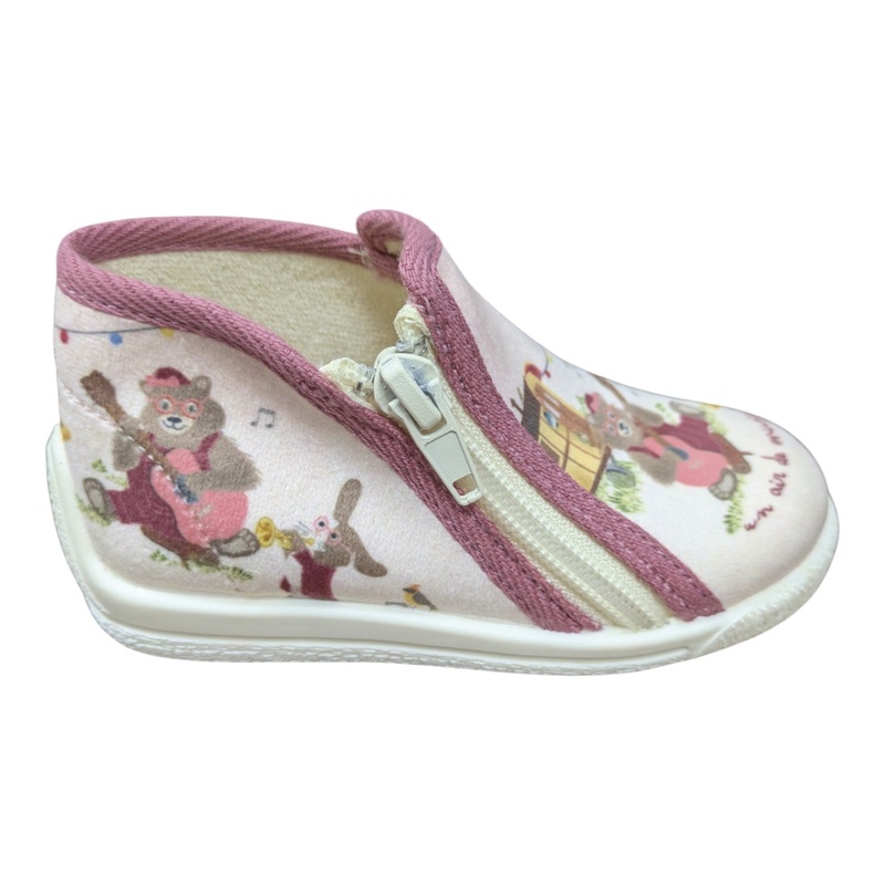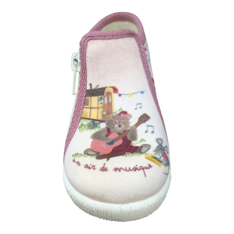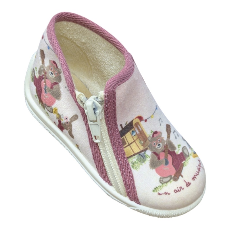Ce chausson BELLAMY au coloris beige et rose séduira par son joli motif d’ourson jouant de la musique.