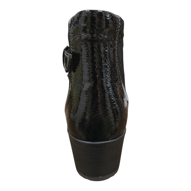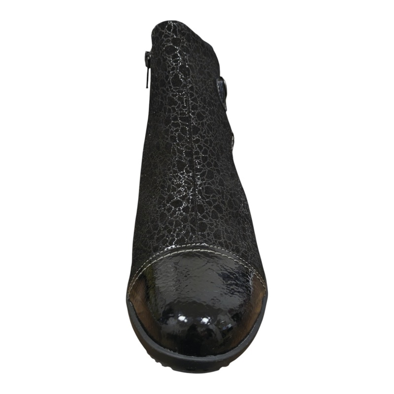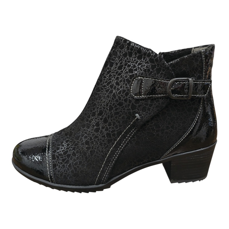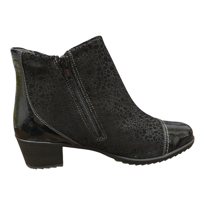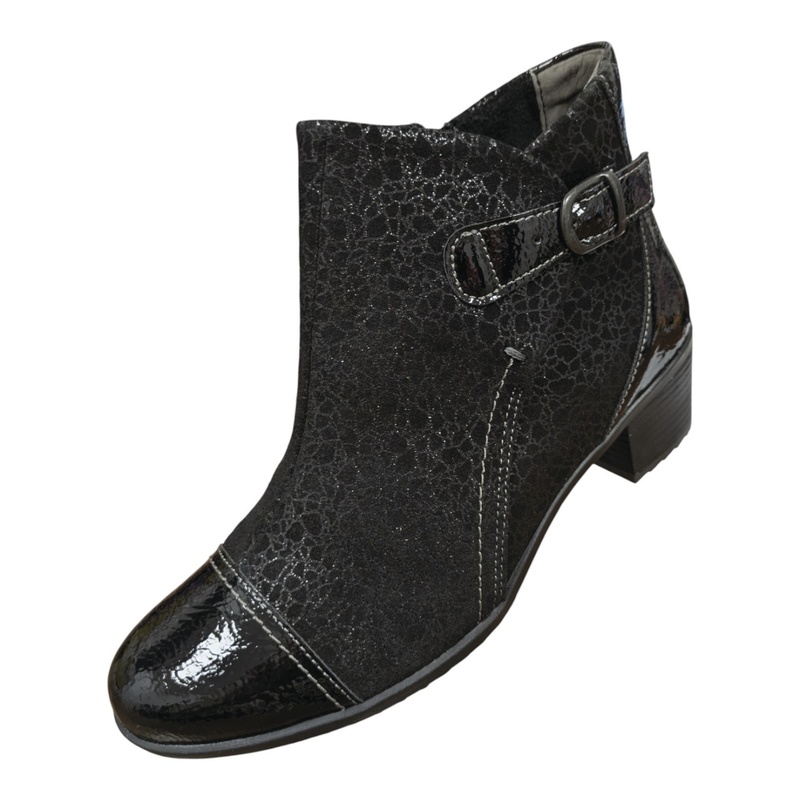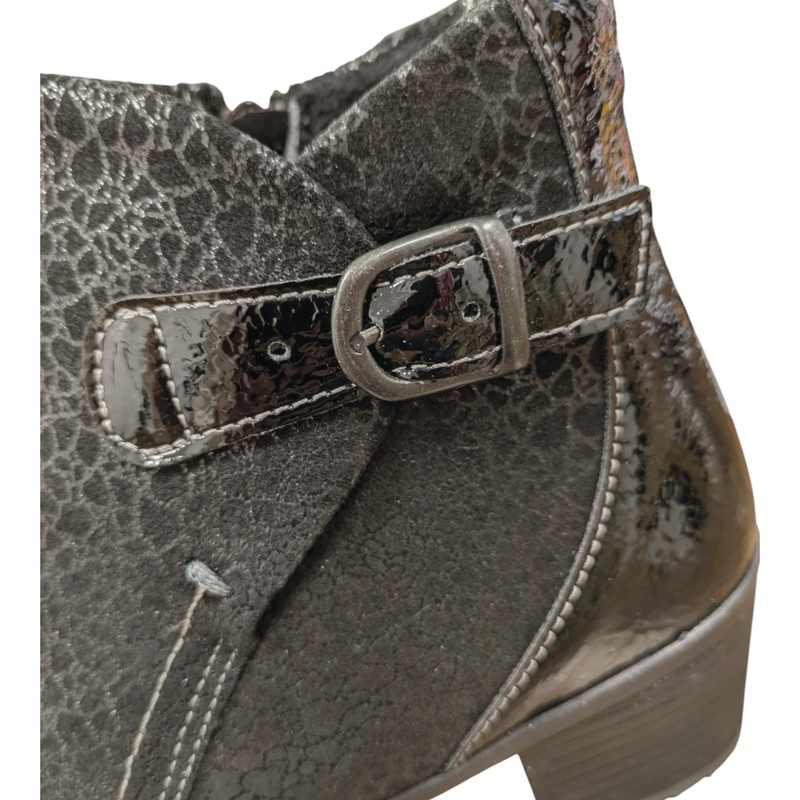 Cette élégante bottine en cuir imprimé offre un large chaussant. Une fermeture éclair est située sur le côté intérieur du pied.