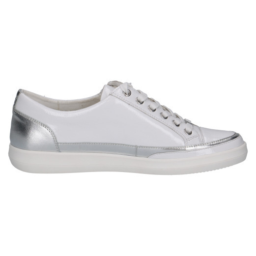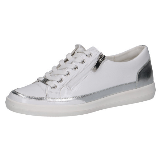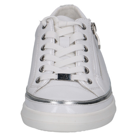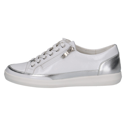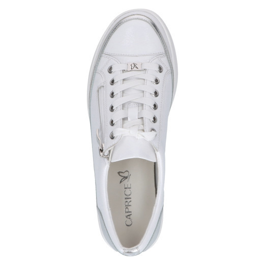 • Sneakers Caprice largeur G en cuir verni blanc à lacets et zip – empiècement argent