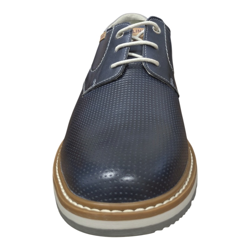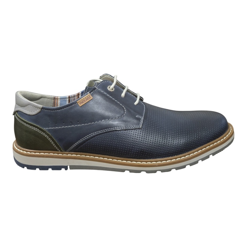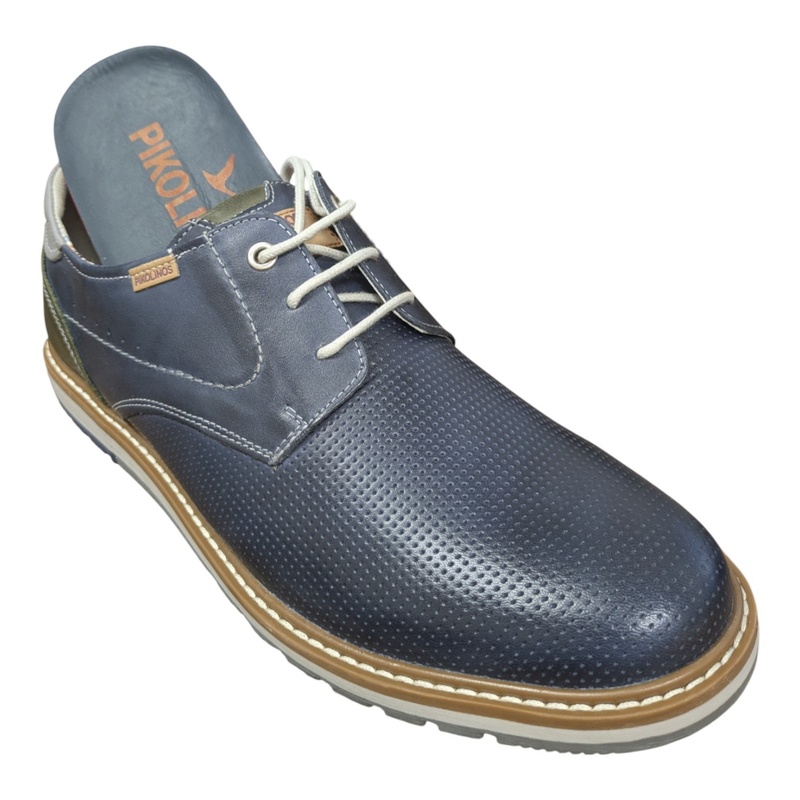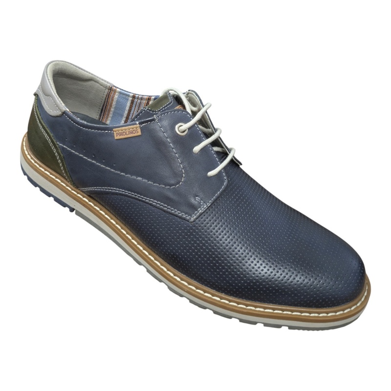 Ce derby en cuir marine mat micro-perforé offre une bonne respirabilité tout en conservant une allure chic. Les empiècements kaki et gris au niveau du talon apportent une touche contemporaine et contrastée.
