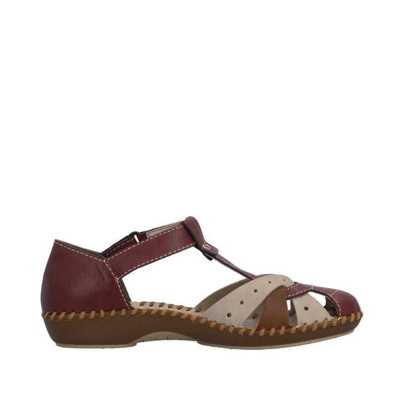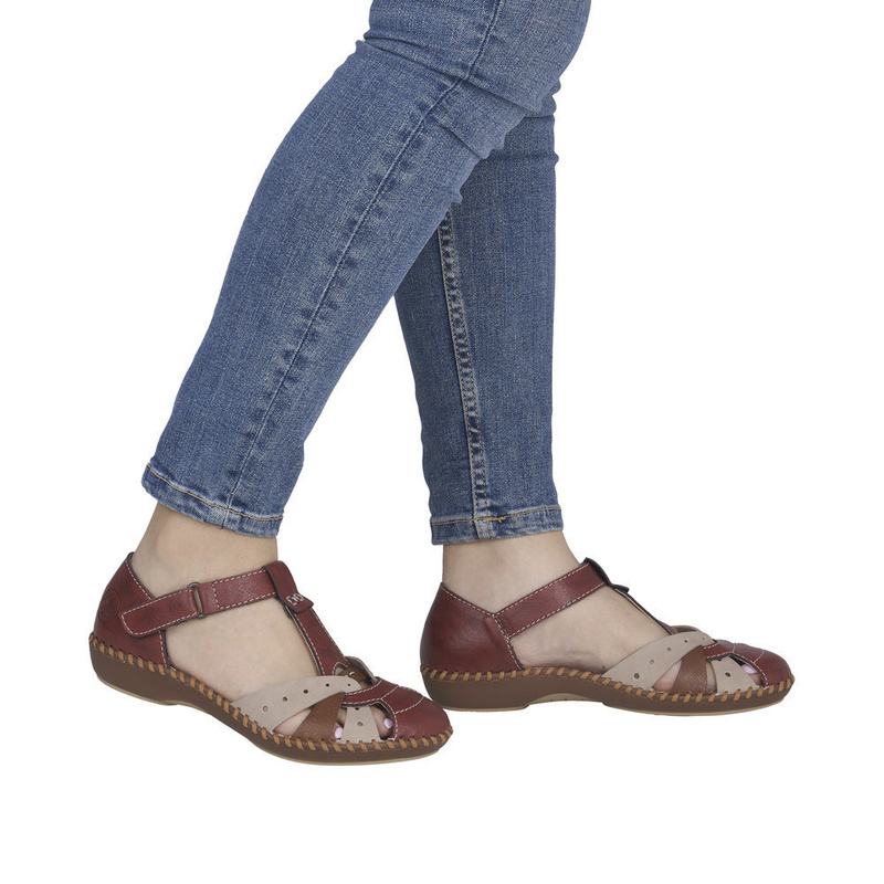 Alliant confort et style estival, cette sandale ouverte Rieker rouge et beige est idéale pour accompagner vos tenues d’été avec légèreté et maintien.
