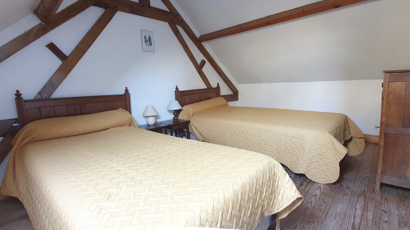 A l'étage : Une chambre avec lit de 160x200, puis une seconde chambre avec deux lits simples de 90x190.