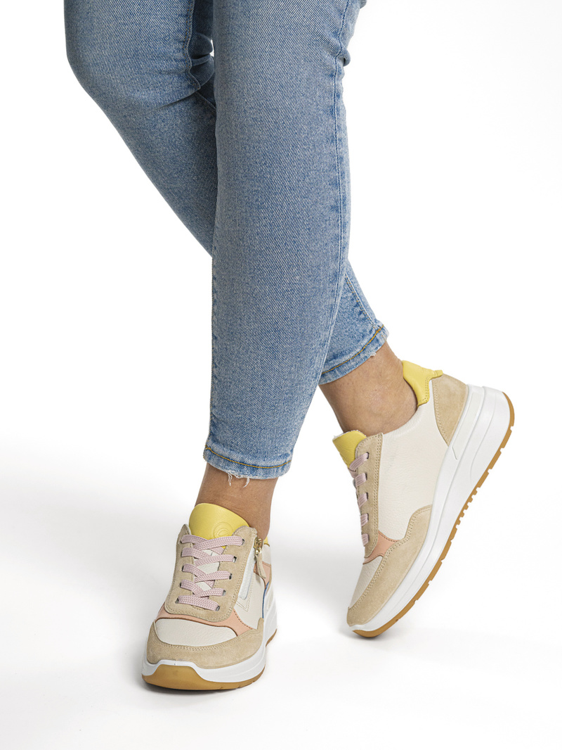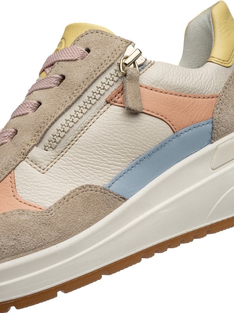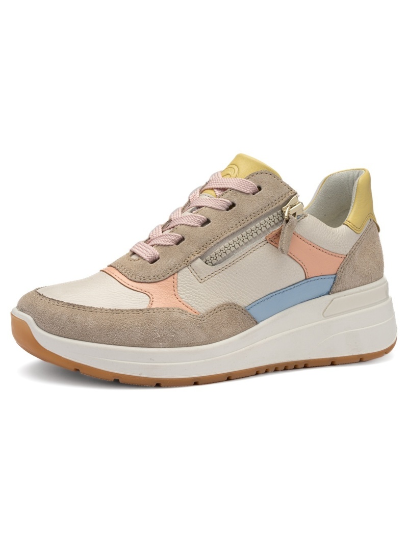 Alliez confort et féminité avec ces sneakers compensées Ara largeur H. Leur coloris beige rehaussé d’empiècements rose et bleu et de lacets roses apporte une touche moderne et lumineuse à vos tenues.