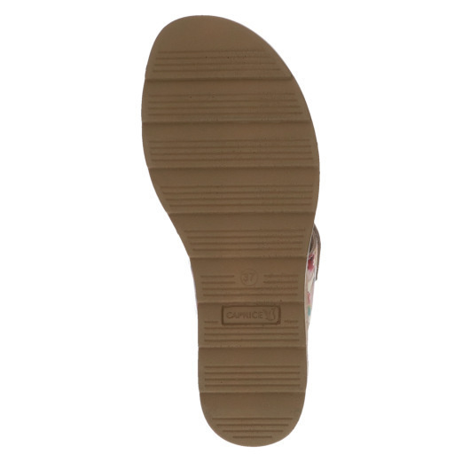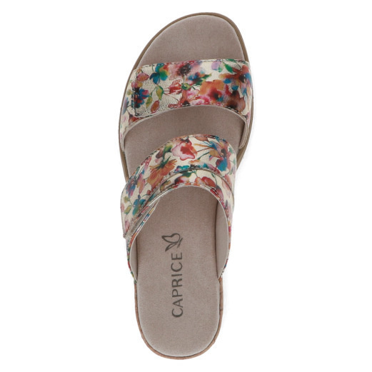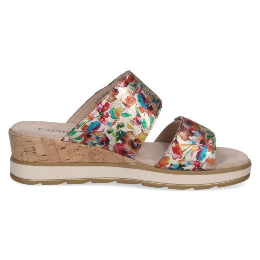 Élégante et confortable, cette mule compensée Caprice largeur G se distingue par son cuir multicolore avec fond doré, qui apporte une touche lumineuse et originale à vos tenues estivales.